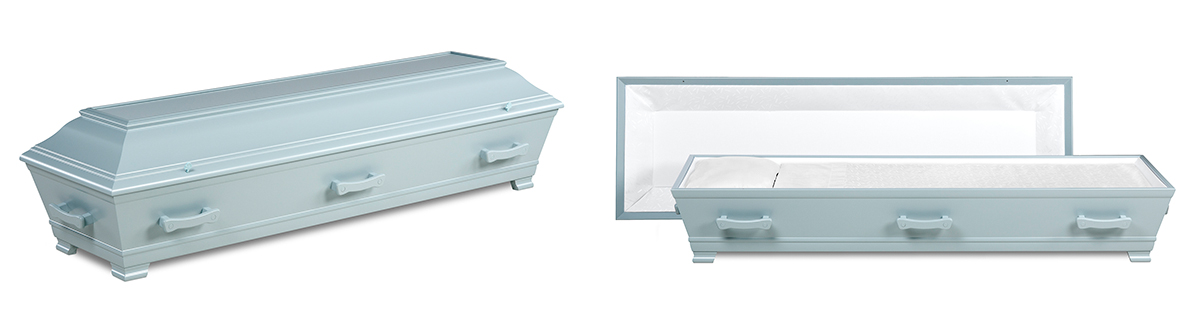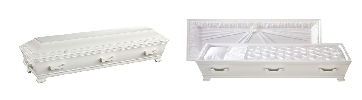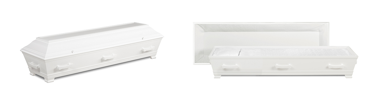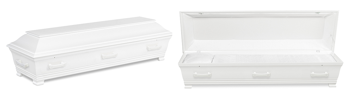 Massiv hvitmalt bjørkekiste med sidehenglset lokk. Leveres ferdig innredet. Vekt: 51 kg