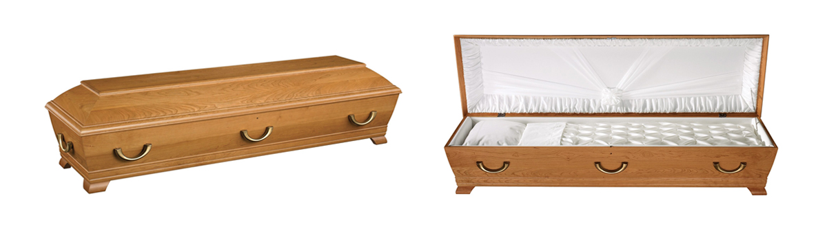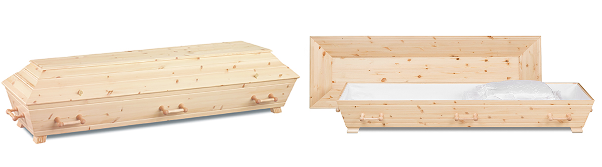Lakkert furukiste med trehåndtak. Kisten leveres ferdig innredet. Vekt: 35 kg